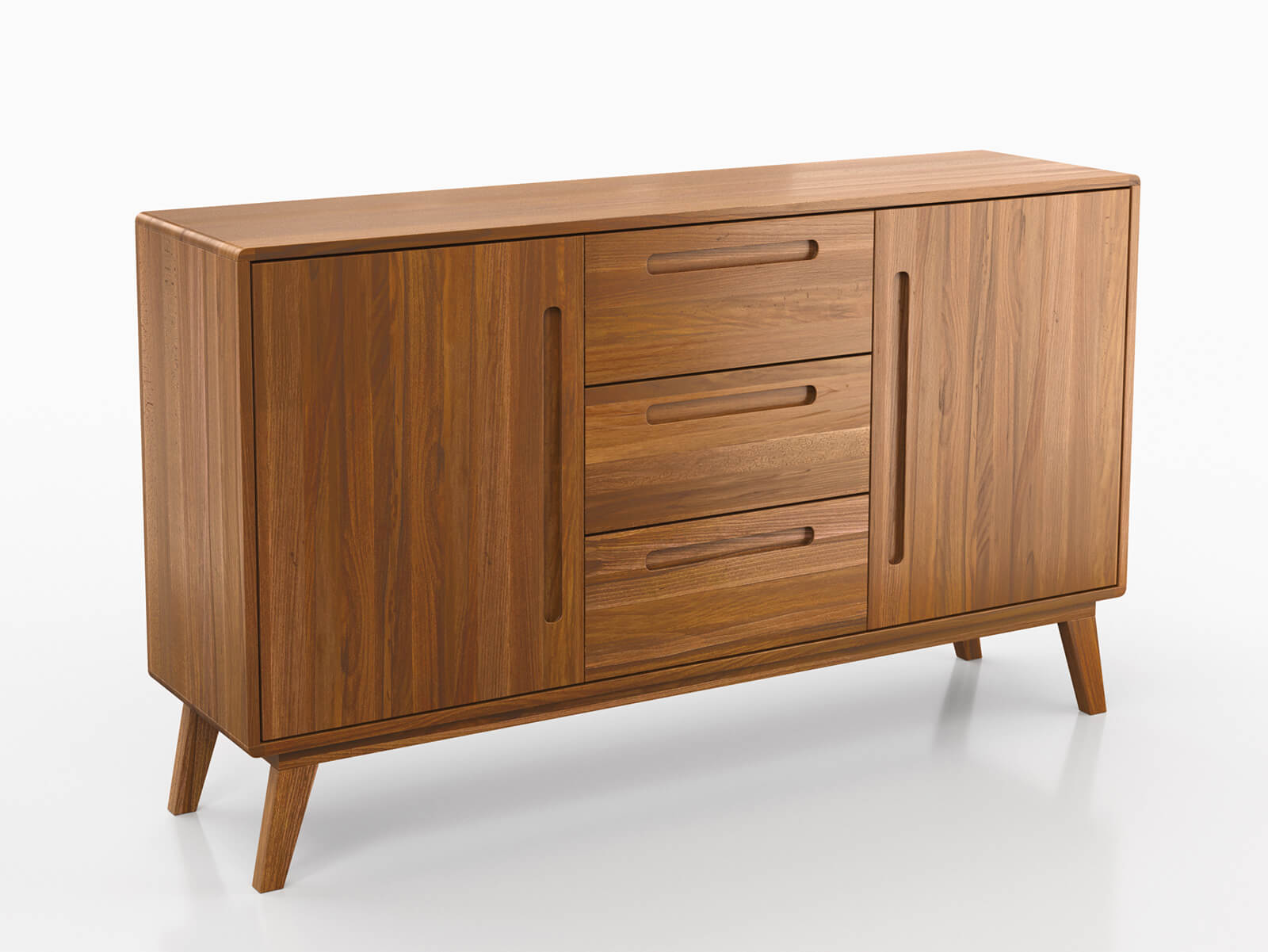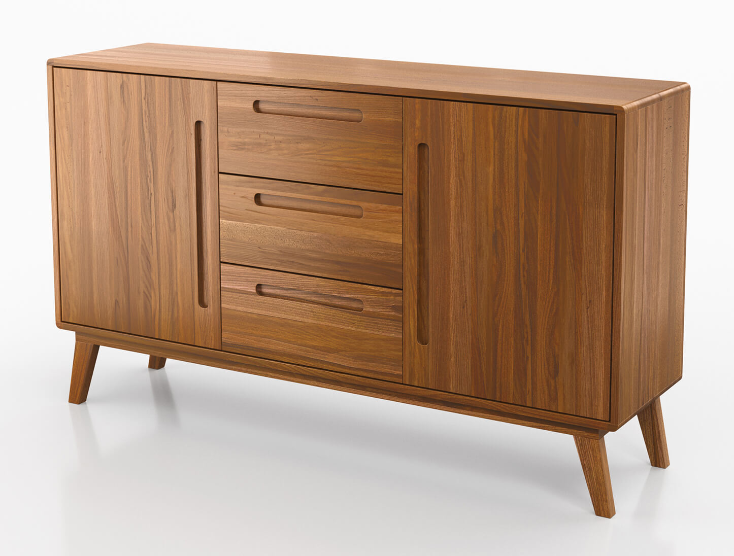 Szilárdság és funkcionalitás - A bükkfa komód fő előnye a masszív felépítés, miközben megtartja az optimális méreteket. A komód belsejében három tágas fiók és két szekrény található, amelyek további tárolóhelyet biztosítanak. Mindkét szekrényben egy-egy polc is található. A fiókokat Blum fix vezetők hajtják, biztosítva a csendes nyitást, míg az ajtók ugyanezen cég zsanérjaival vannak felszerelve, biztosítva a komód kivételes használati komfortját.