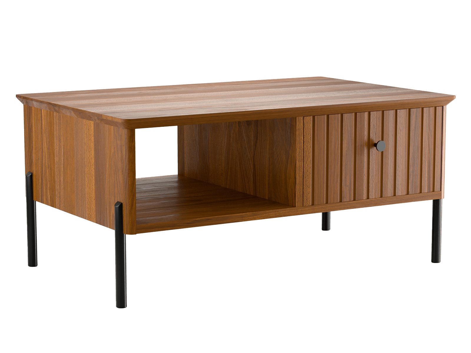 Az asztalt a praktikusságot szem előtt tartva tervezték, az esztétika feláldozása nélkül. Nyitott polccal rendelkezik újságoknak, könyveknek vagy távirányítóknak, valamint egy zárható, mart előlappal ellátott szekrény, amely lehetővé teszi a kisebb tárgyak diszkrét tárolását, így a nappali rendben tartható. Kompakt mérete és geometriai formája tökéletes kiegészítője mind a kisebb, mind a nagyobb enteriőröknek.