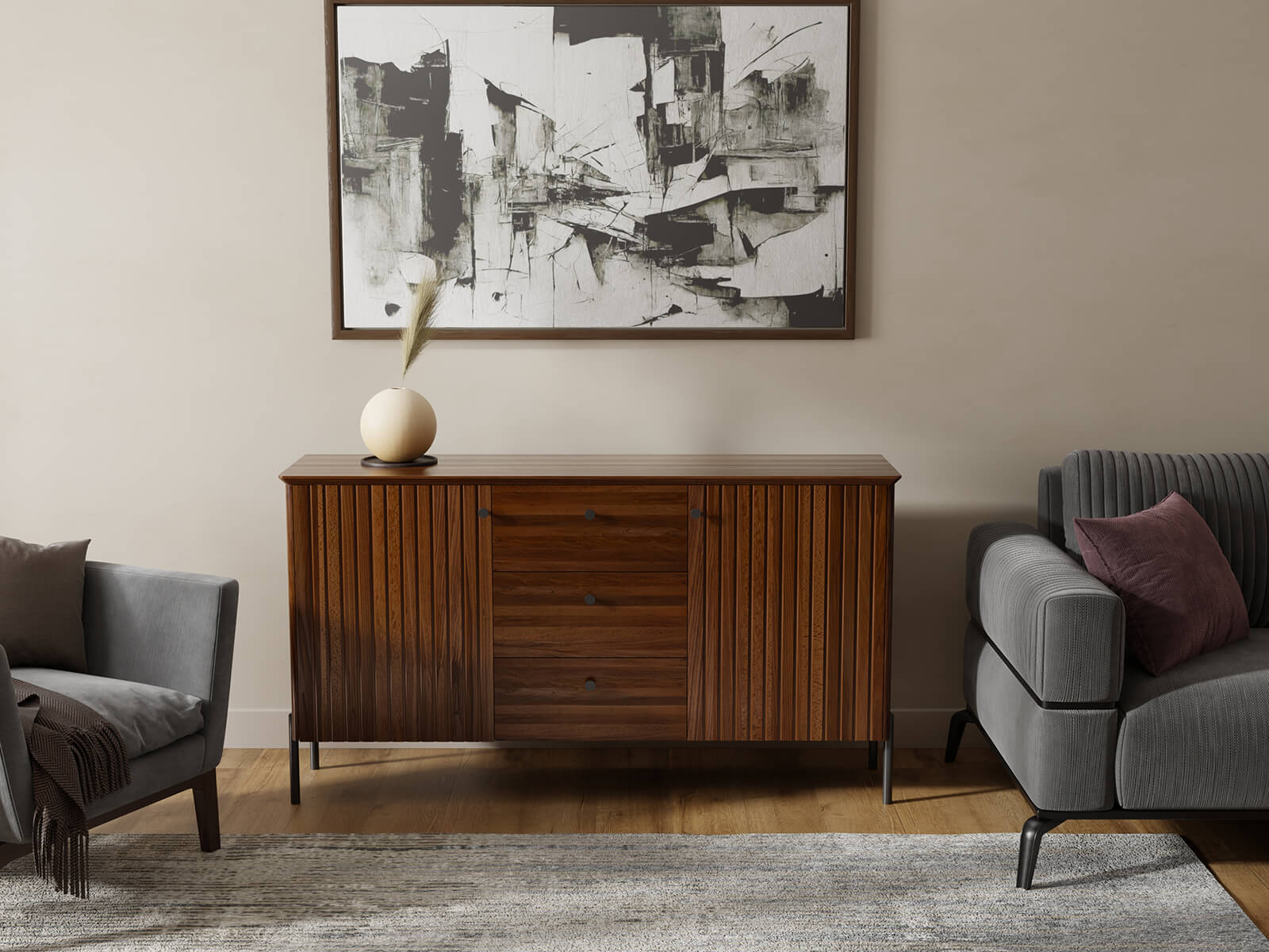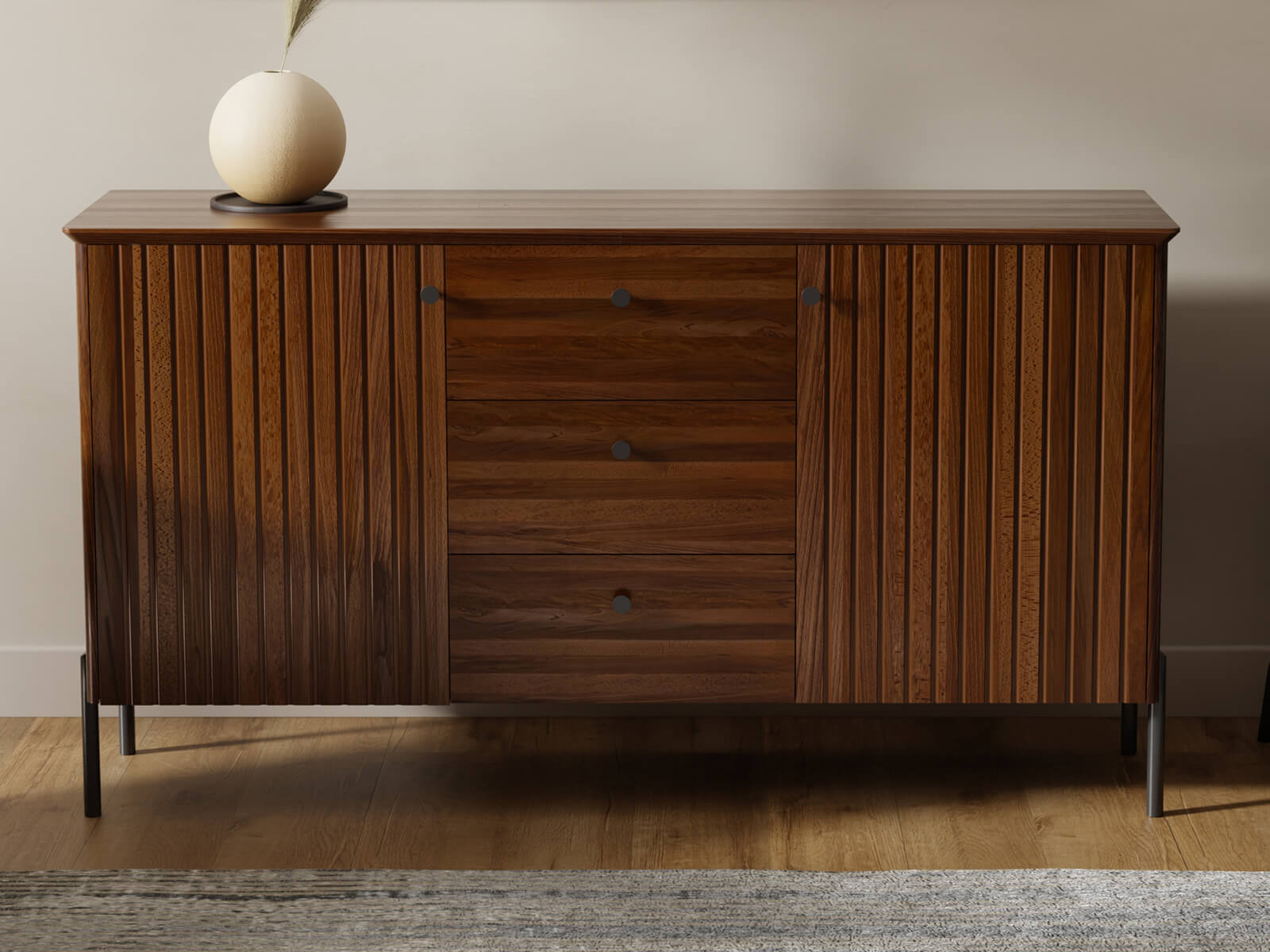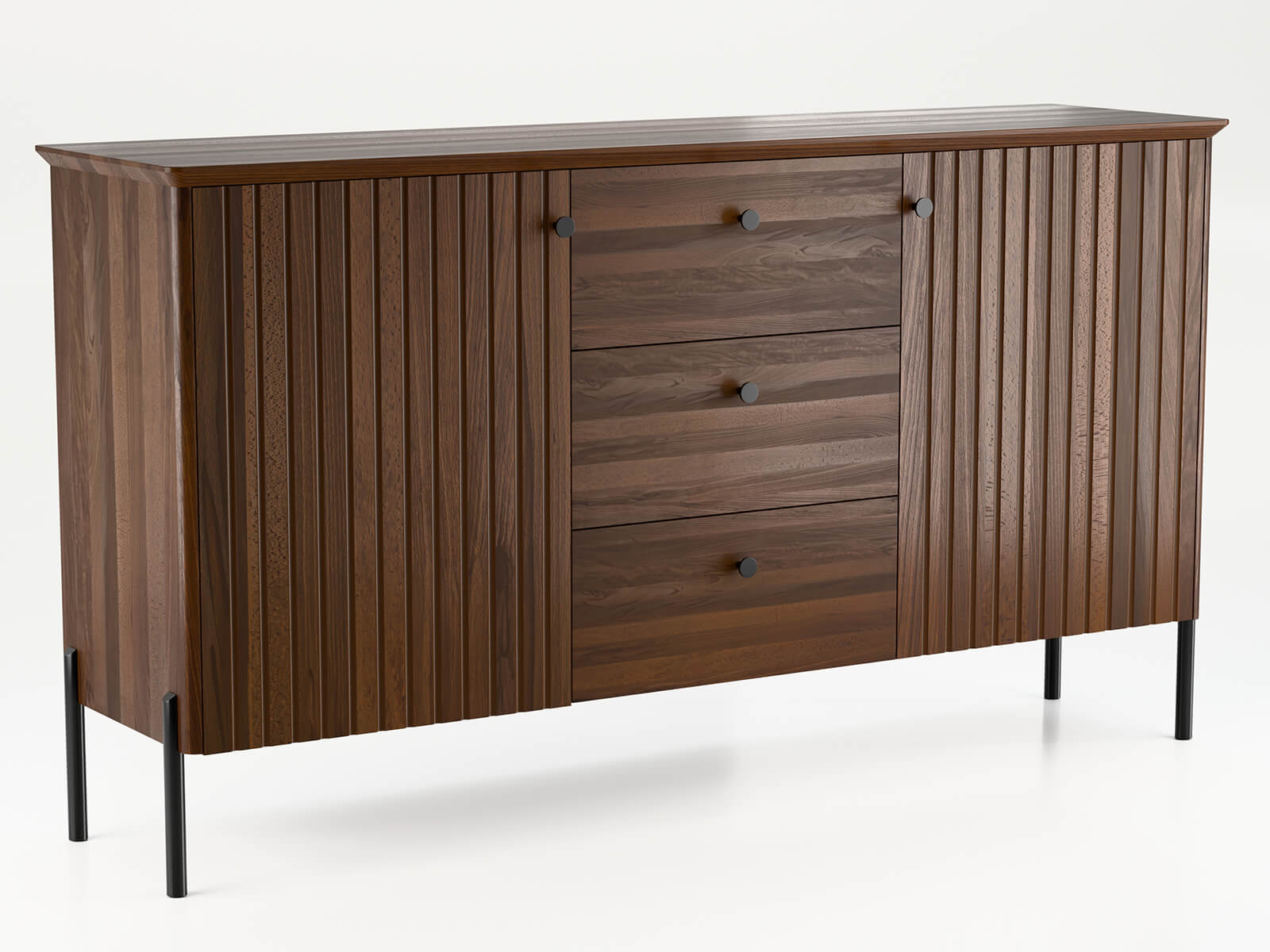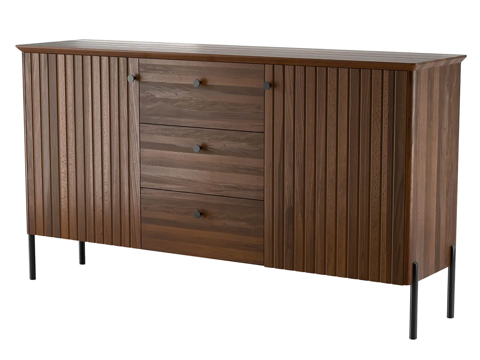 A tálalószekrény három tágas fiókkal és két zárható szekrényel rendelkezik, amelyek kényelmes tárolást biztosítanak különféle tárgyaknak – ruháktól és textíliáktól kezdve dokumentumokon és lakberendezési kiegészítőkön át. A BLUM lágyan záródó futósín rendszer biztosítja a sima és csendes fióknyitást, kiemelve a magas minőséget és kényelmet.