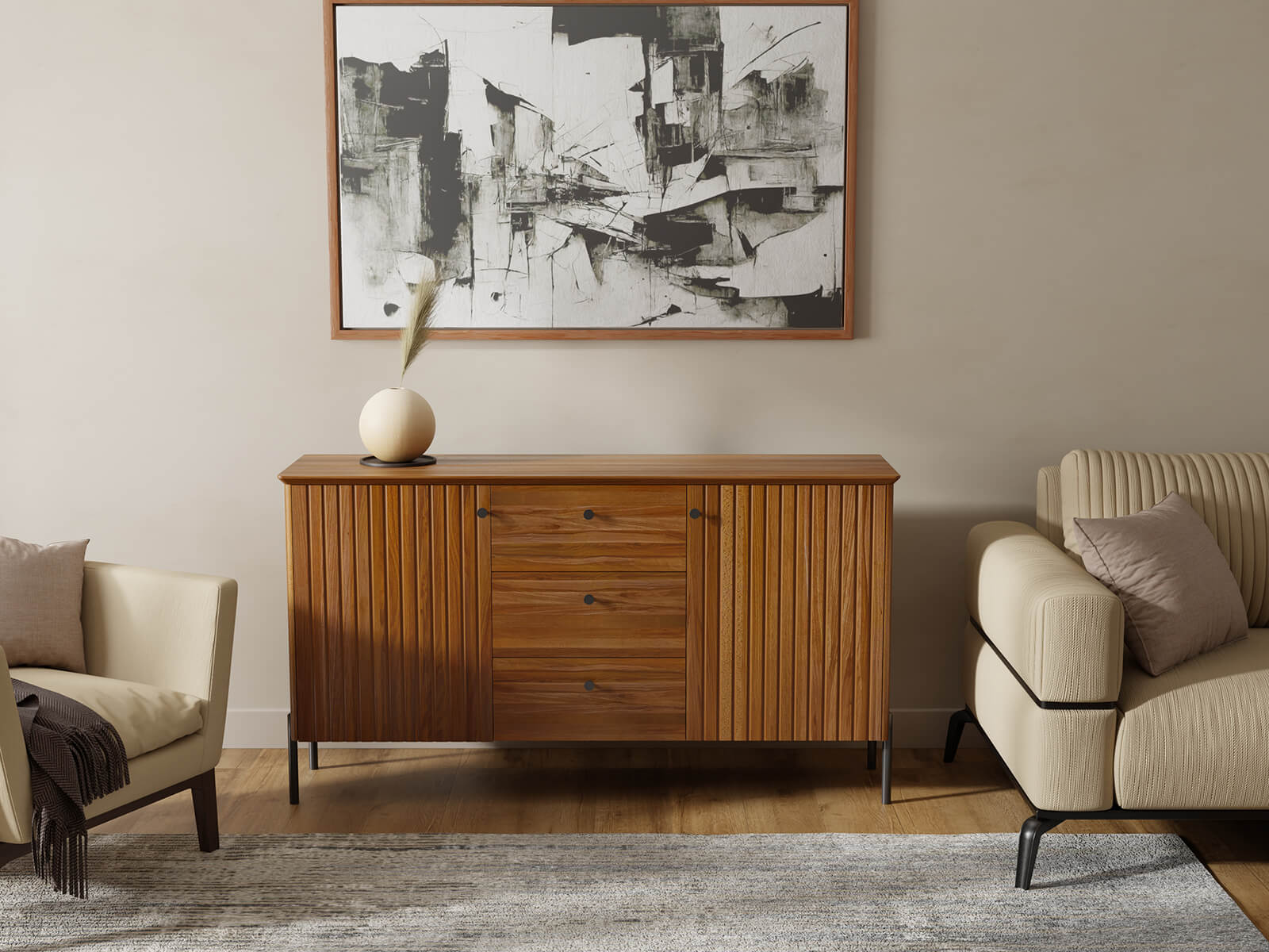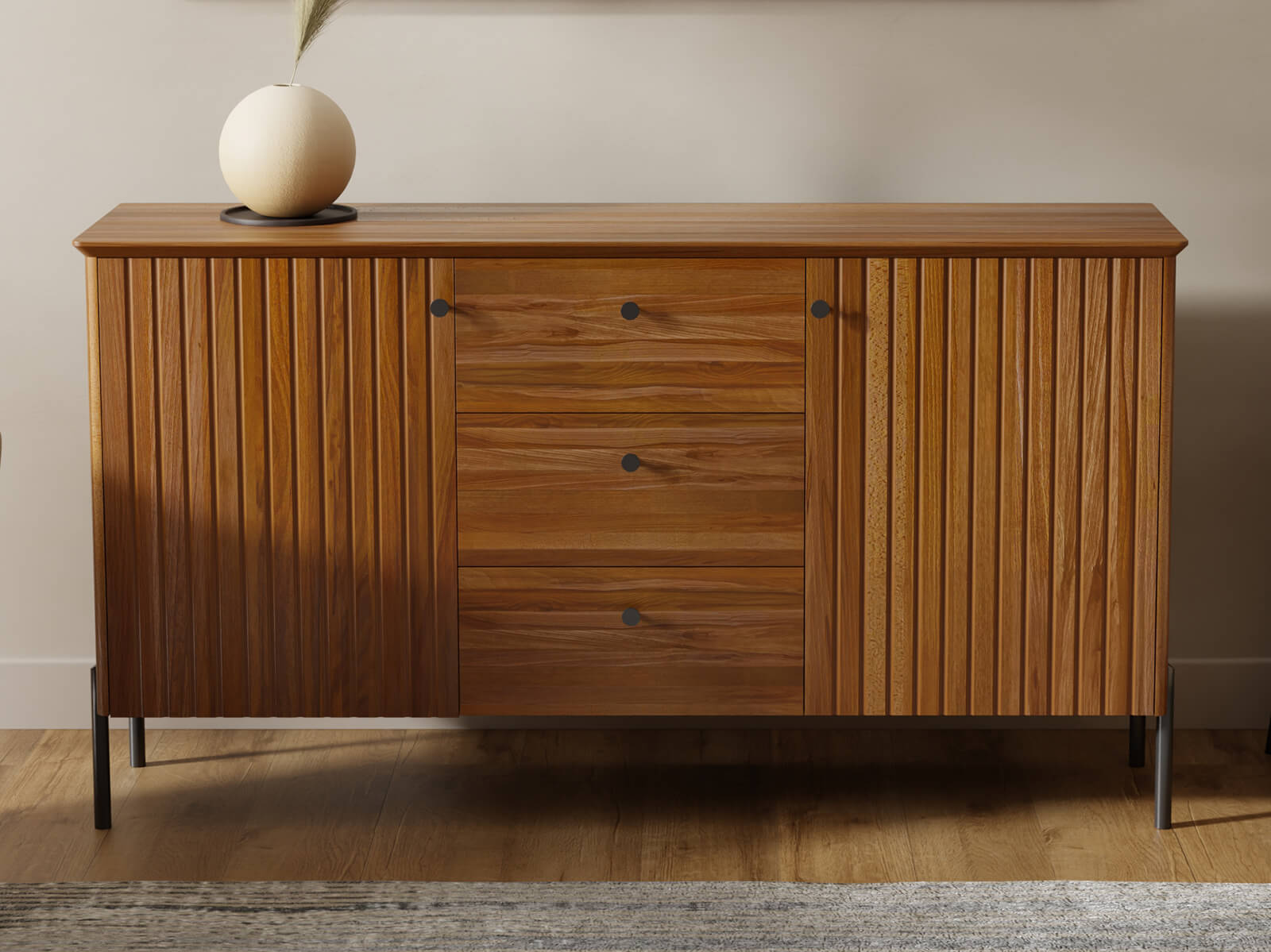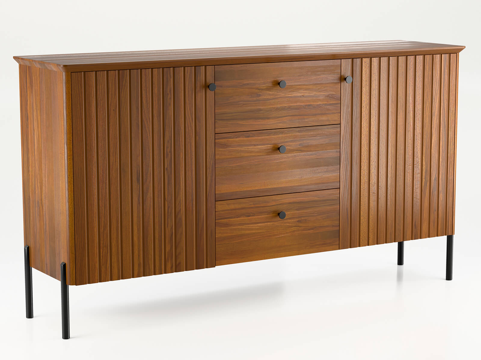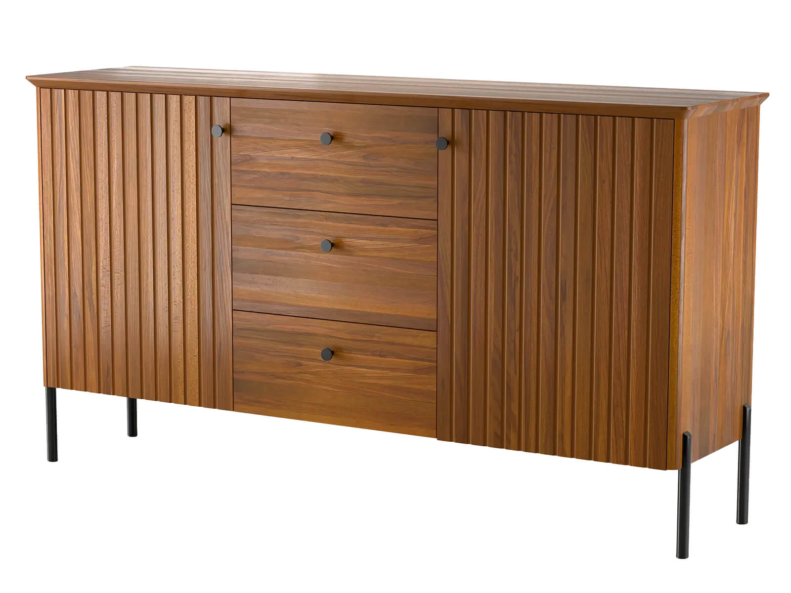 A tálalószekrény három tágas fiókkal és két zárható szekrényel rendelkezik, amelyek kényelmes tárolást biztosítanak különféle tárgyaknak – ruháktól és textíliáktól kezdve dokumentumokon és lakberendezési kiegészítőkön át. A BLUM lágyan záródó futósín rendszer biztosítja a sima és csendes fióknyitást, kiemelve a magas minőséget és kényelmet.