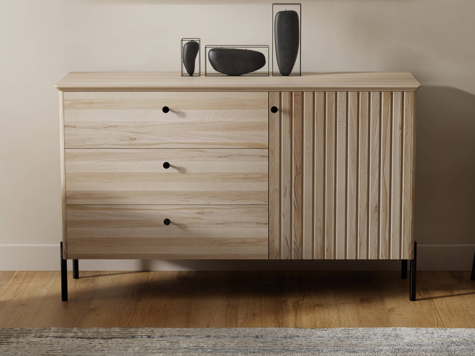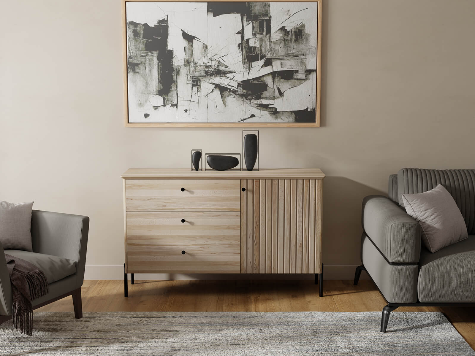 A tálalószekrény három tágas fiókkal és egy zárható szekrényel rendelkezik, így kényelmes tárolást biztosít különféle tárgyaknak – ruháktól és textíliáktól kezdve dokumentumokon és lakberendezési kiegészítőkön át. A BLUM lágyan záródó rendszer garantálja a sima és csendes fióknyitást, kiemelve a magas minőséget és a kényelmet.