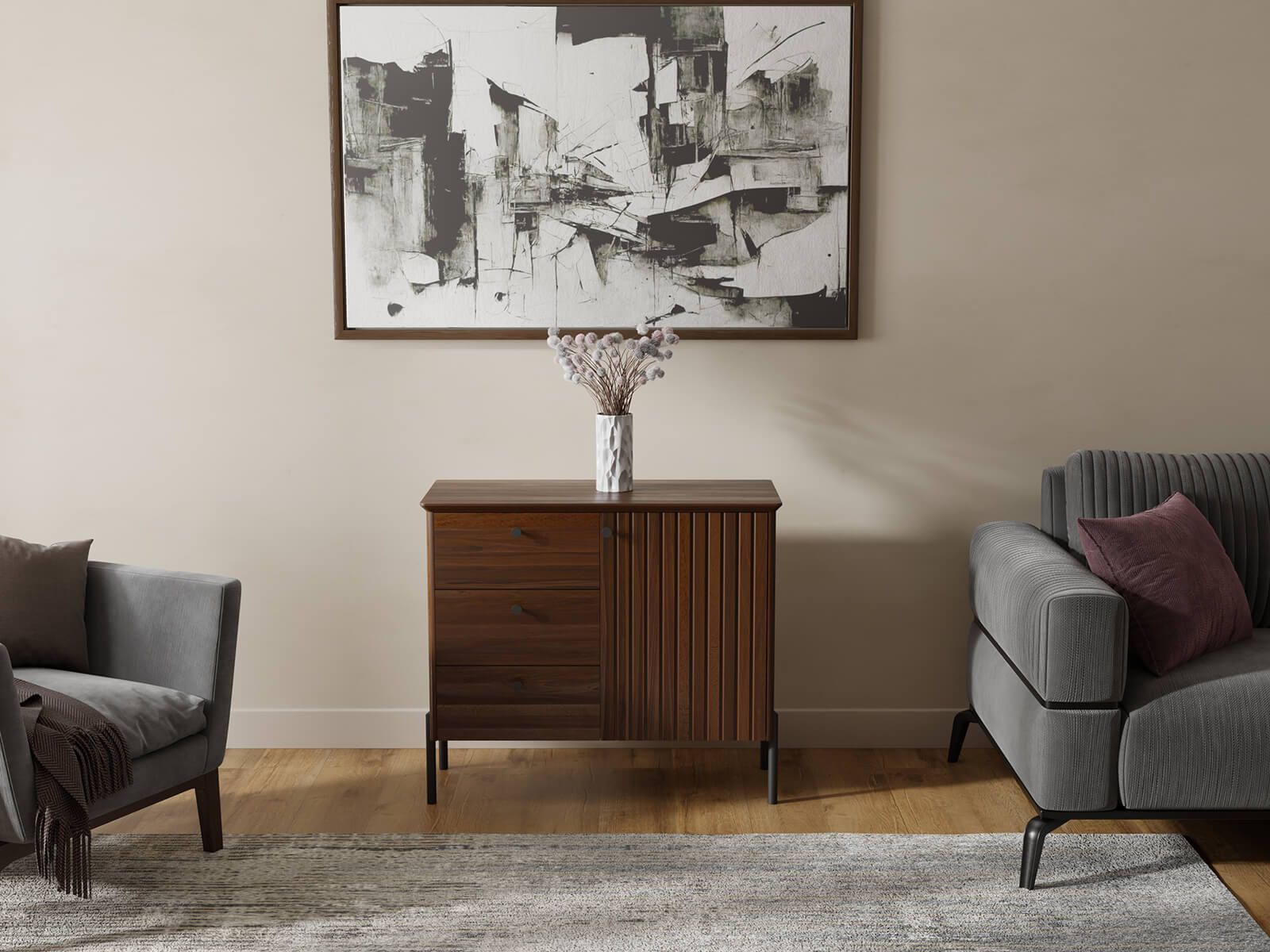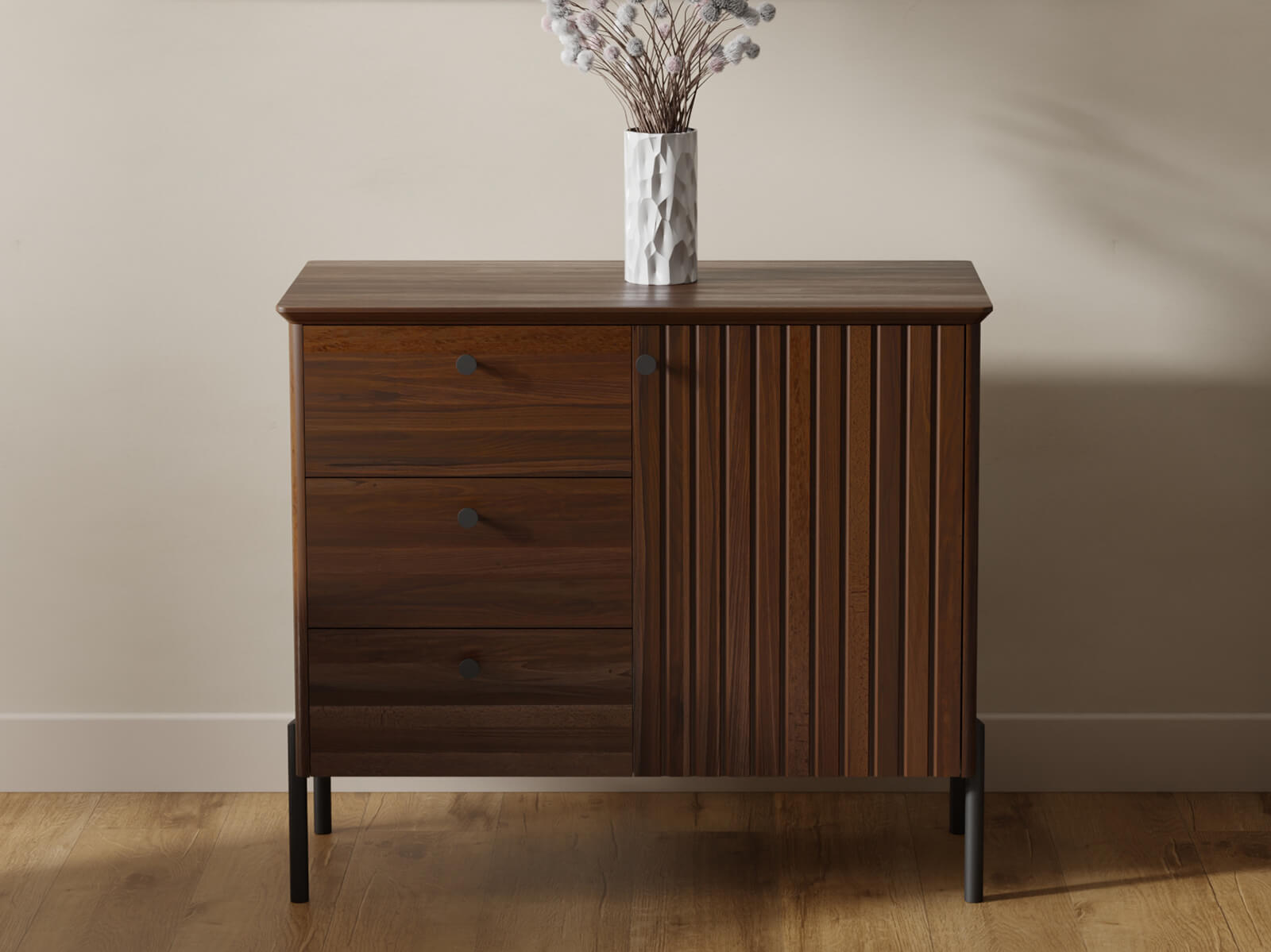 A tálalószekrény három tágas fiókkal és egy zárható szekrényel rendelkezik, így kényelmes tárolást biztosít különféle tárgyaknak – ruháktól és textíliáktól kezdve dokumentumokon és lakberendezési kiegészítőkön át. A BLUM lágyan záródó rendszer garantálja a sima és csendes fióknyitást, kiemelve a magas minőséget és a kényelmet.