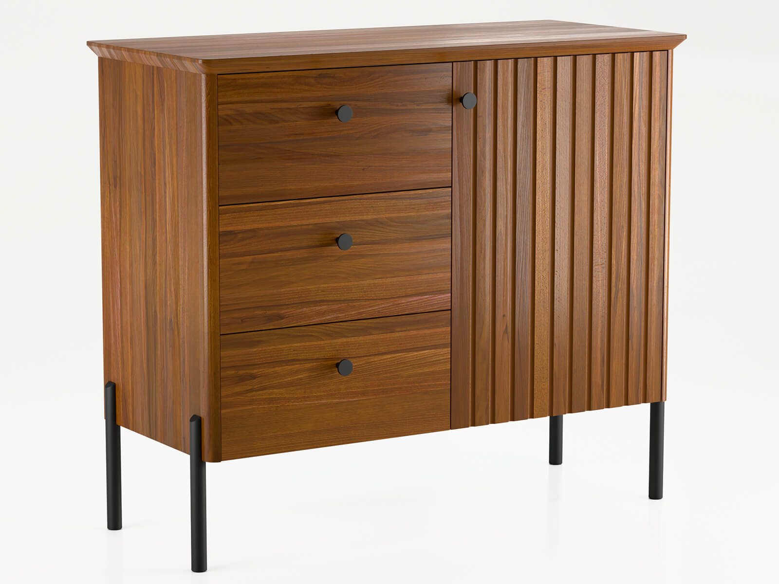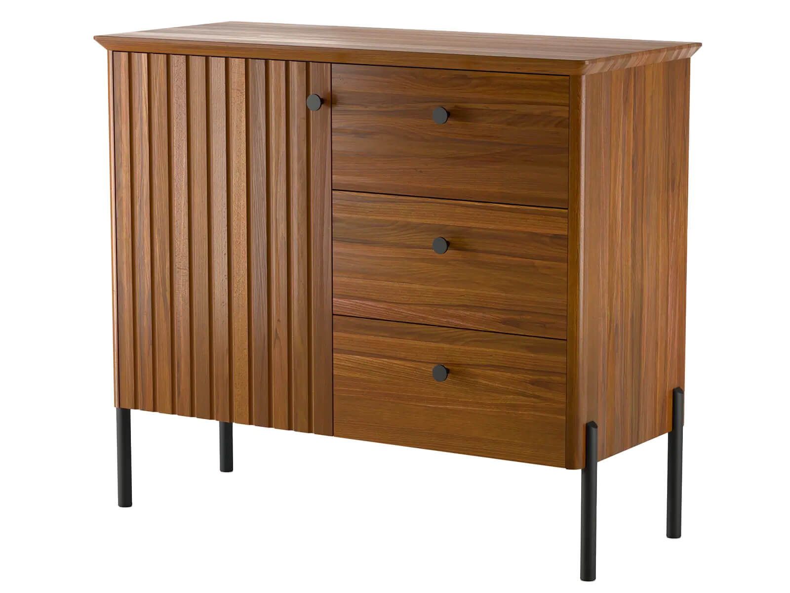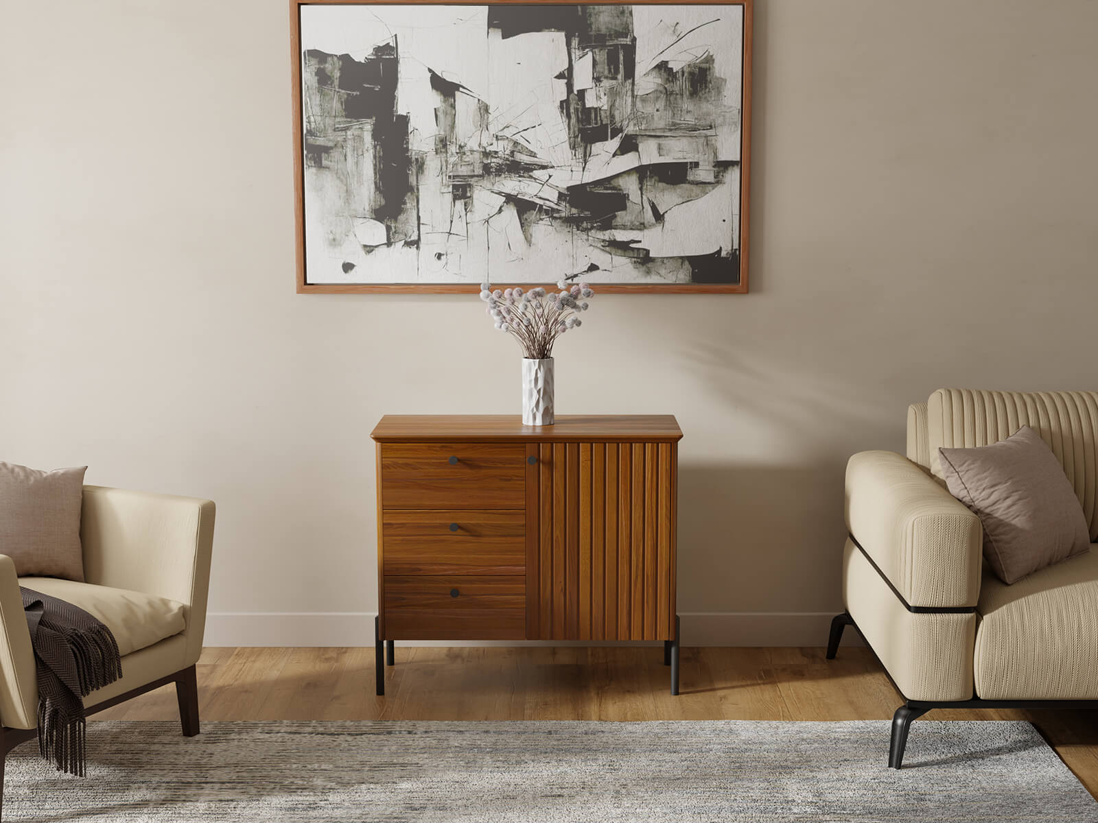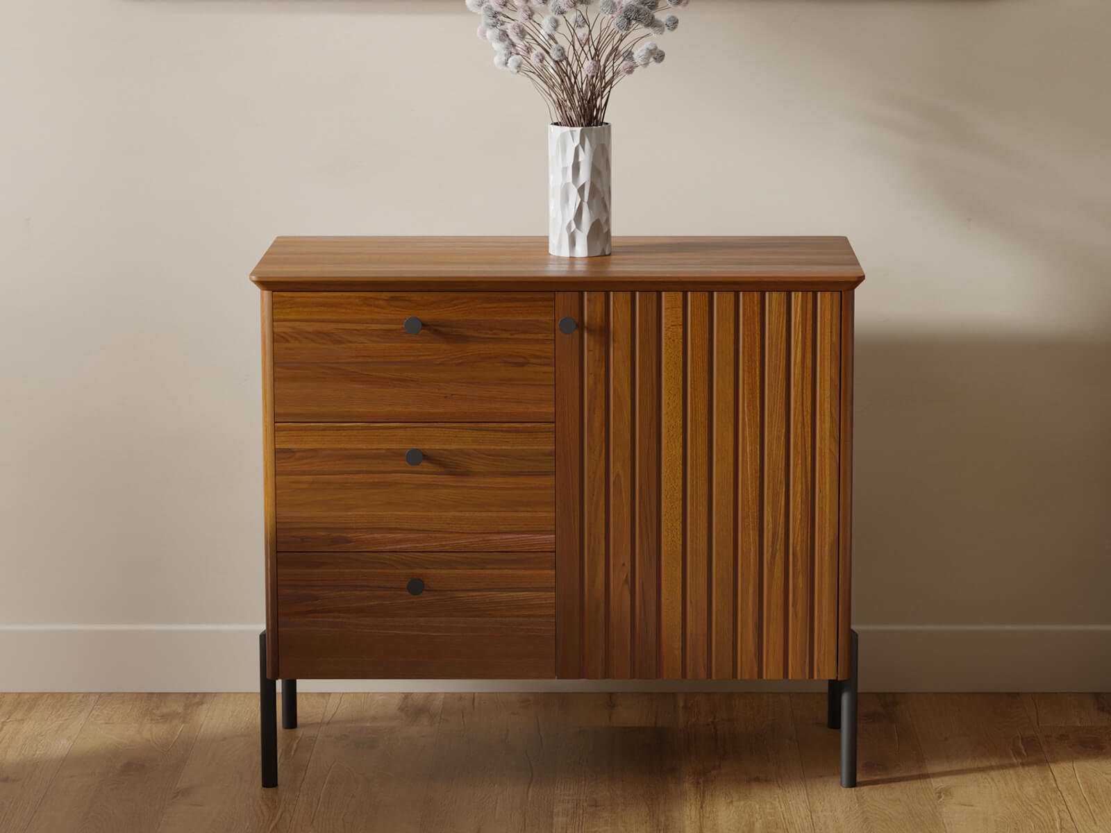 A tálalószekrény három tágas fiókkal és egy zárható szekrényel rendelkezik, így kényelmes tárolást biztosít különféle tárgyaknak – ruháktól és textíliáktól kezdve dokumentumokon és lakberendezési kiegészítőkön át. A BLUM lágyan záródó rendszer garantálja a sima és csendes fióknyitást, kiemelve a magas minőséget és a kényelmet.