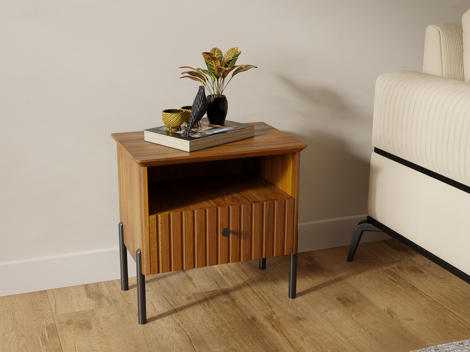A szekrény tágas fiókkal és praktikus polccal rendelkezik, amely kényelmes tárolást biztosít kisebb tárgyaknak, például könyveknek, poharaknak vagy telefonnak. A BLUM lágyan záródó futórendszer biztosítja a fiókok sima és csendes működését, kiemelve a bútor magas minőségét.