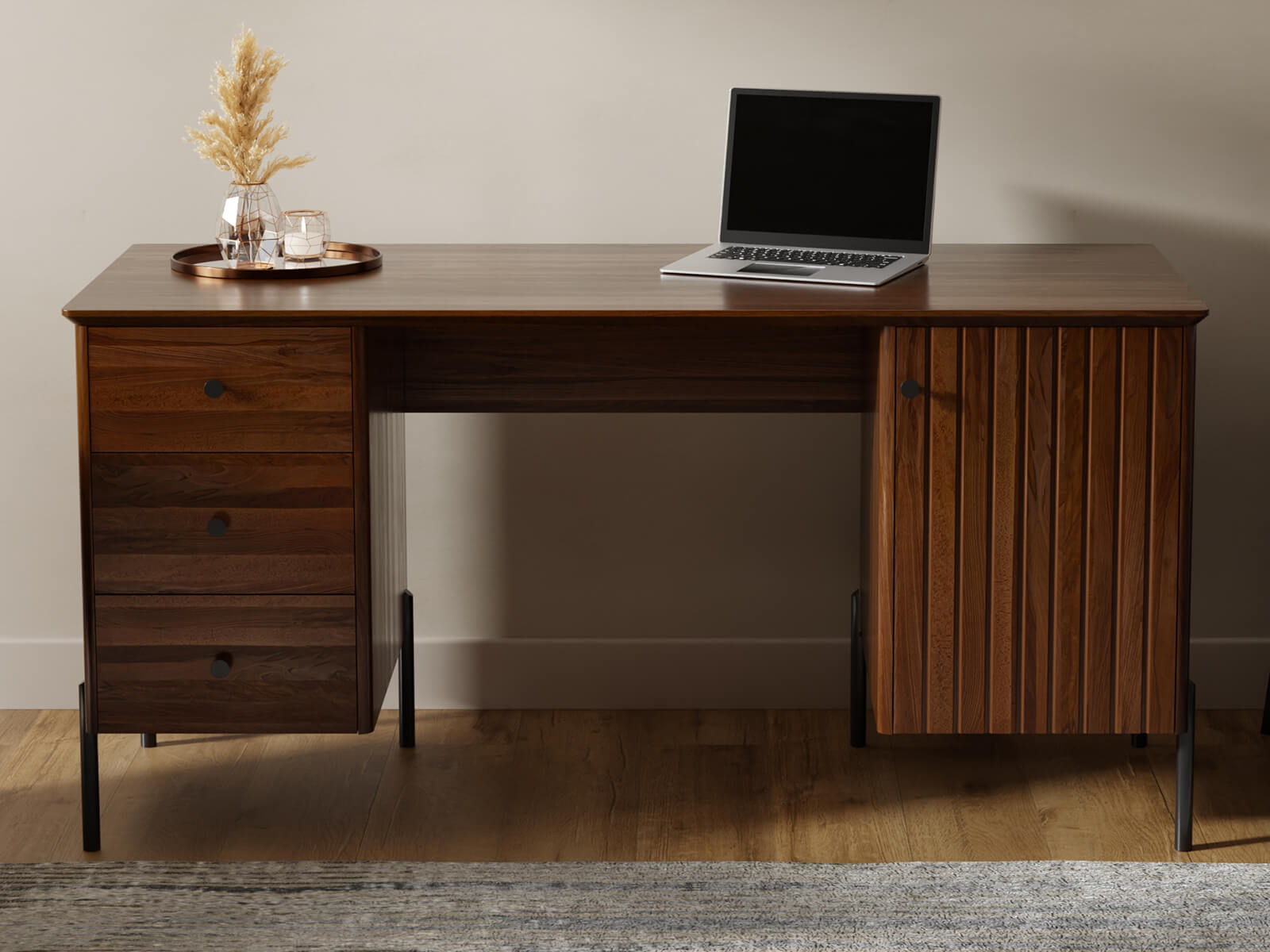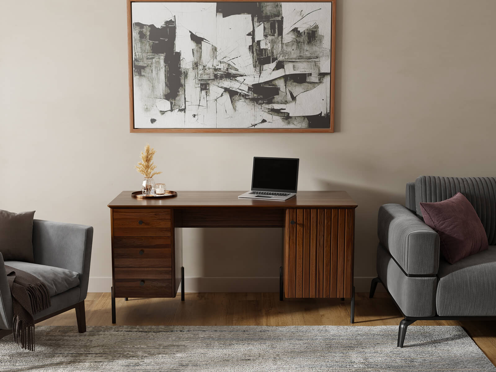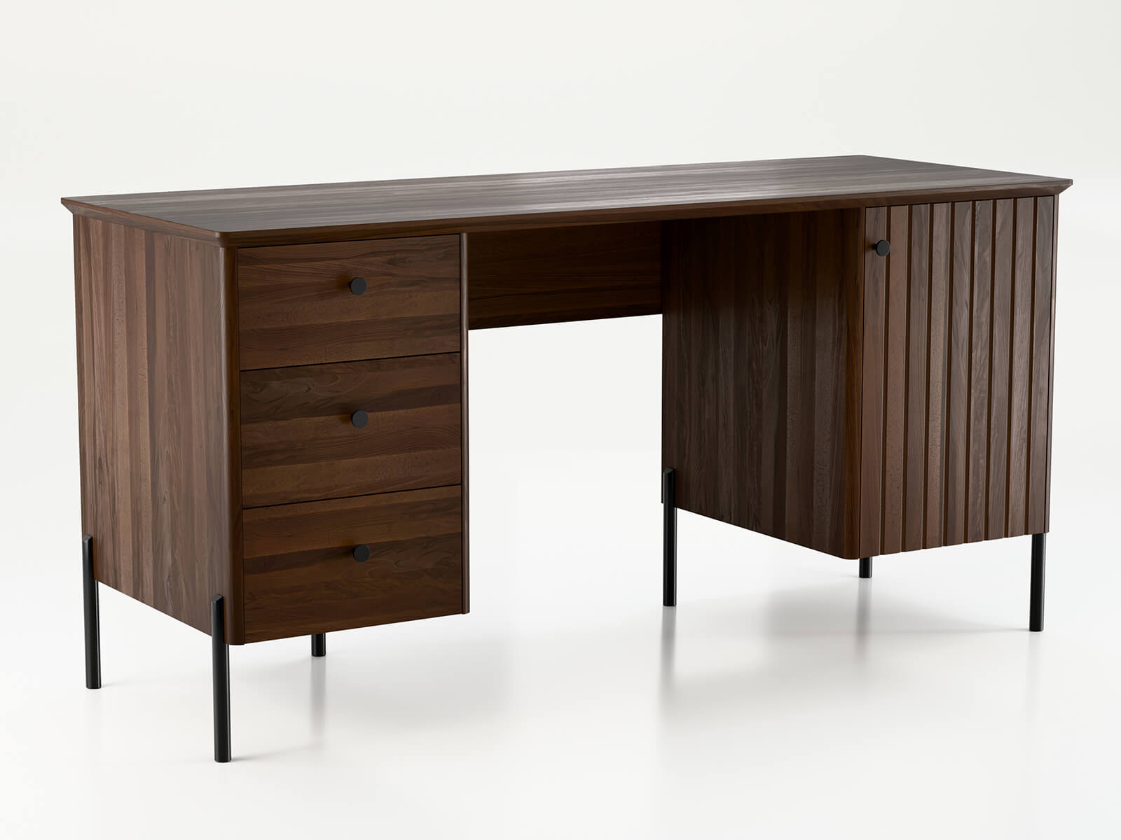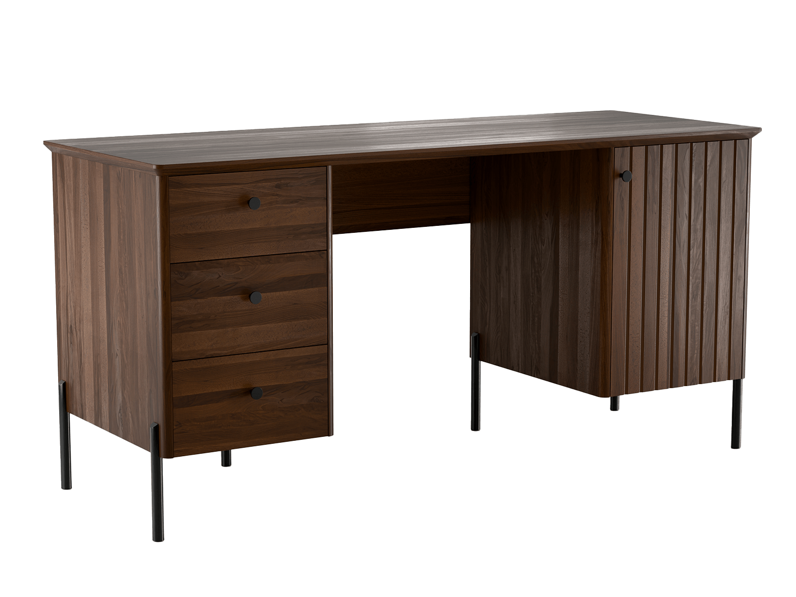 Az íróasztal három tágas fiókkal és egy zárható szekrénnyel van felszerelve, amelyek kényelmes tárolást biztosítanak dokumentumok, kiegészítők és egyéb tárgyak számára. A BLUM lágyan záródó futósín rendszer sima, kényelmes és csendes használatot biztosít, kiemelve a bútor magas minőségét.