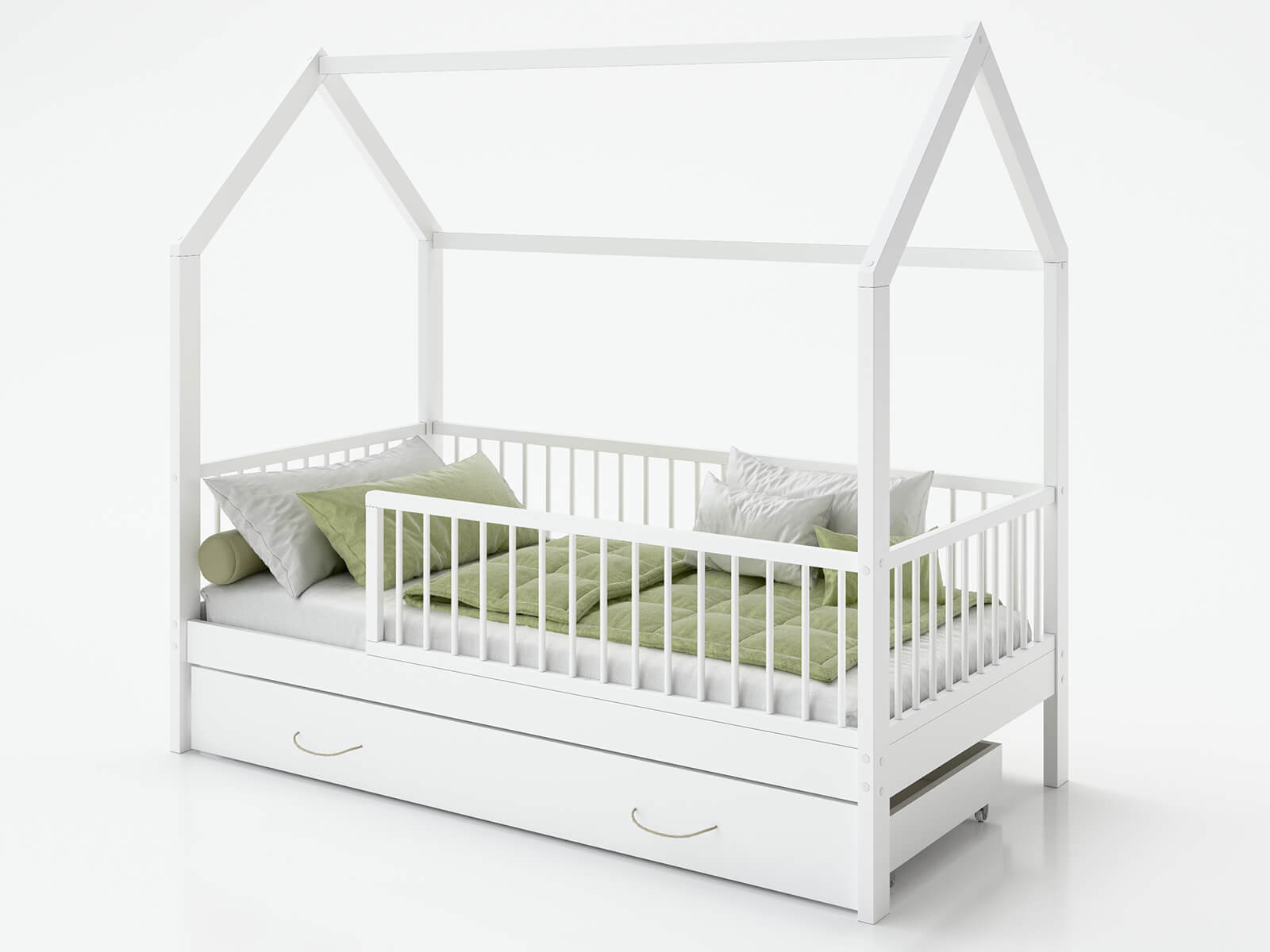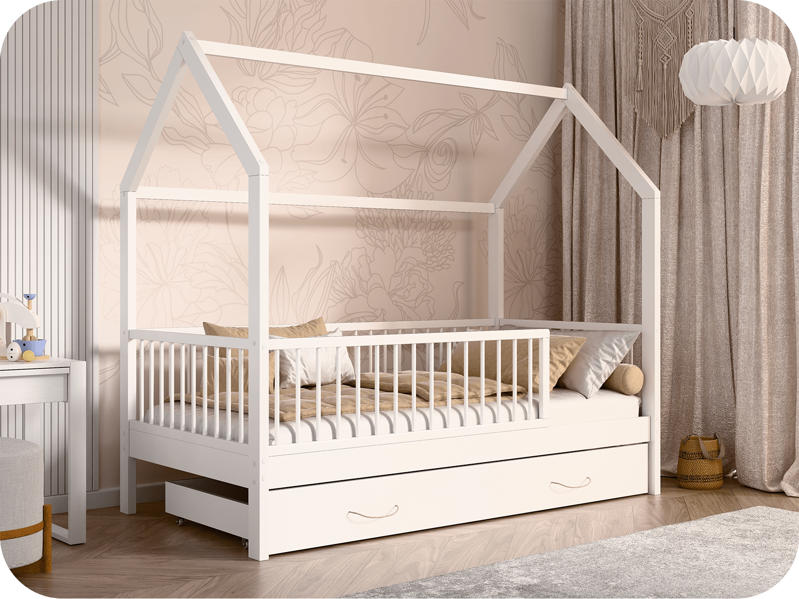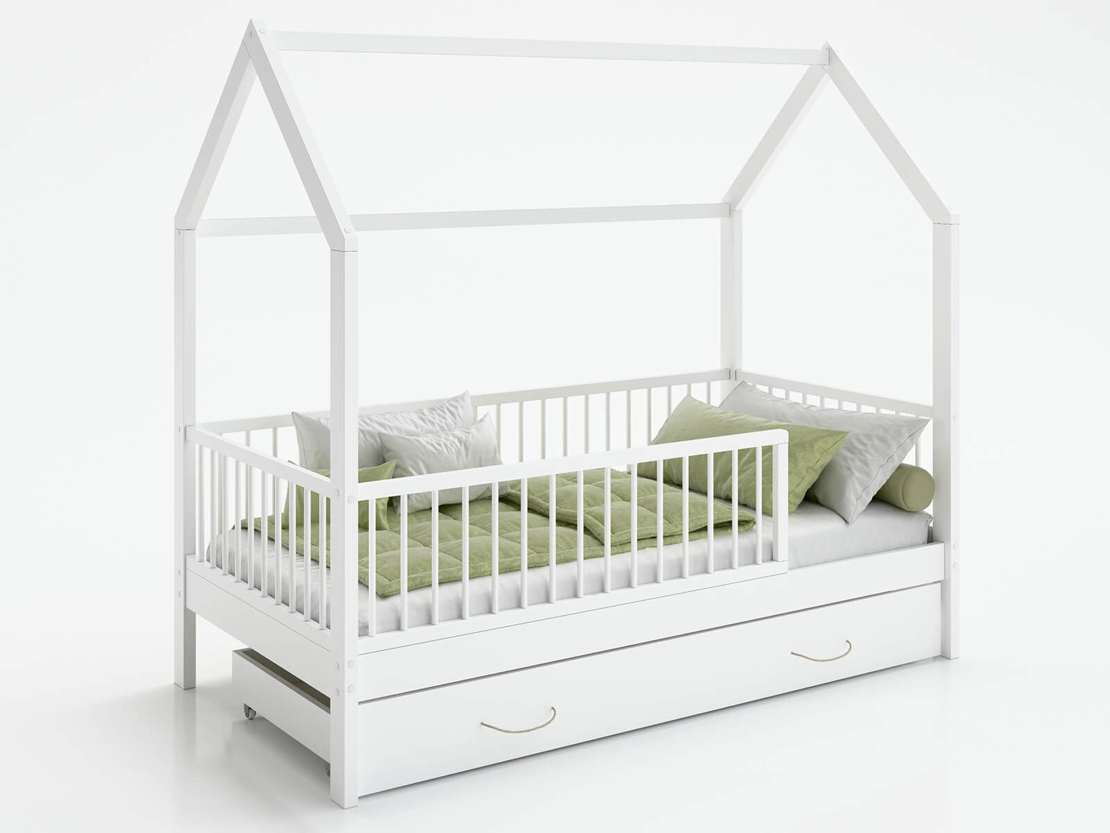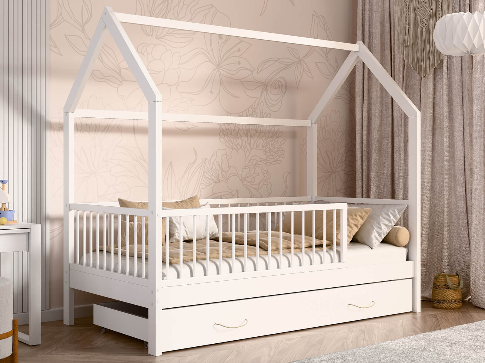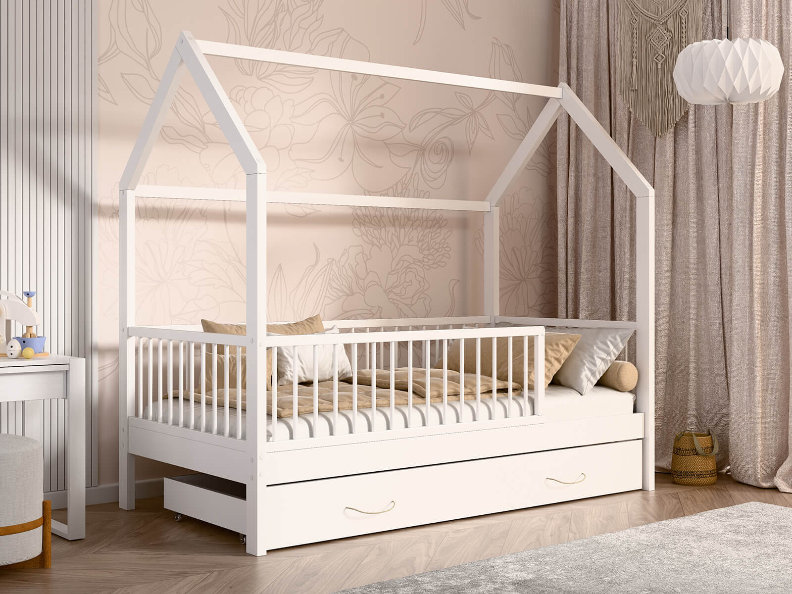Átgondolt dizájn – A ház bájos formája serkenti a gyermek fantáziáját – az ágy nemcsak alvásra, hanem játékra is használható. A kialakítás lehetővé teszi a balról vagy jobbról történő belépést, így tökéletesen illeszkedik bármilyen szobába. A fehér szín és a minimalista fa forma jól illeszkedik mind a modern, mind a klasszikus gyermekenteriőrökbe.