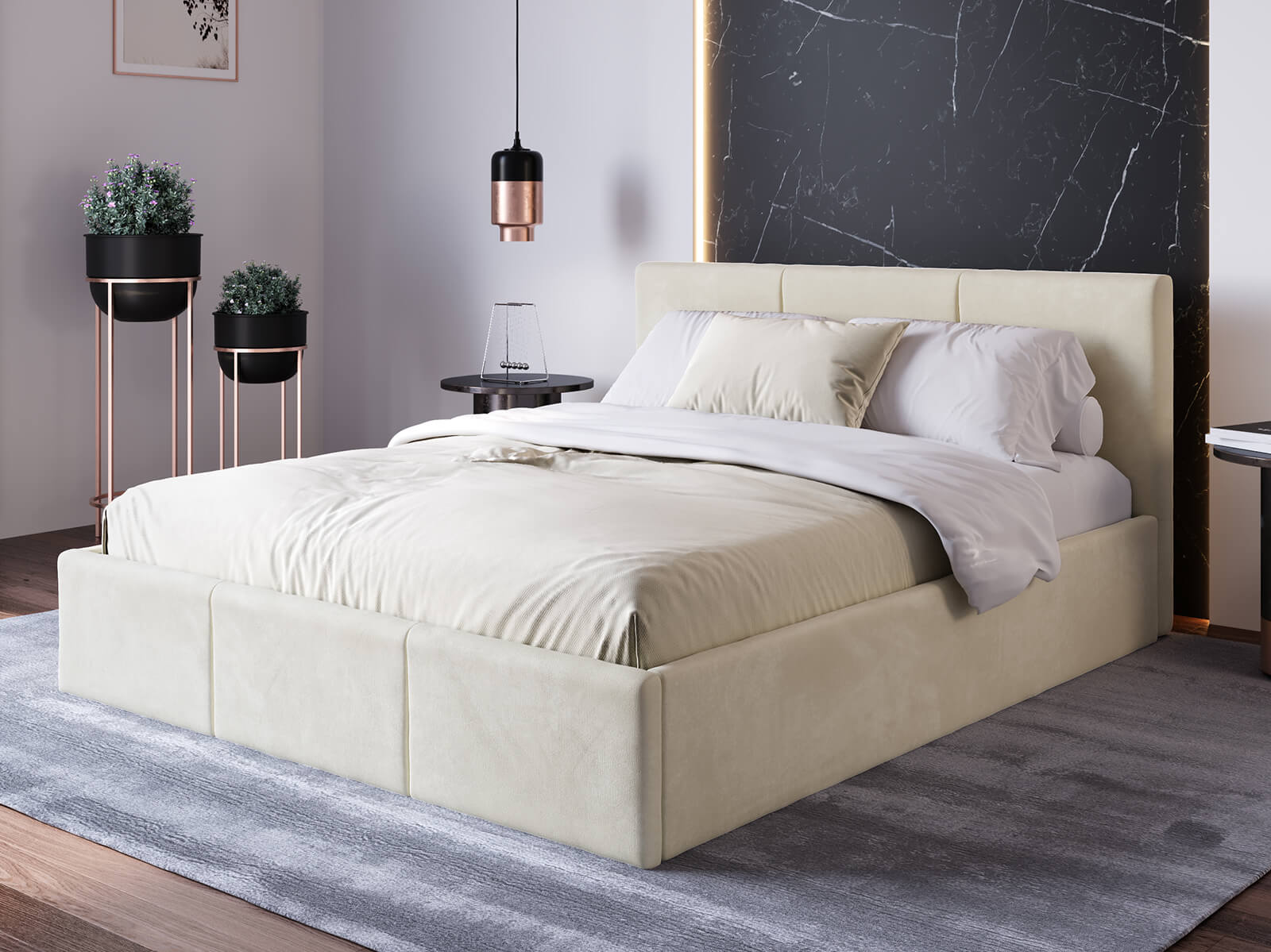 A velúrszövet színe kivételes mélységet és karaktert kölcsönöz az ágynak. A függőleges varrás a fejtámlán és az alacsony előlapon egyedi megjelenést kölcsönöz. Ez az ágy nemcsak kényelmes alvást biztosít, hanem hálószobája központi eleme is lesz.