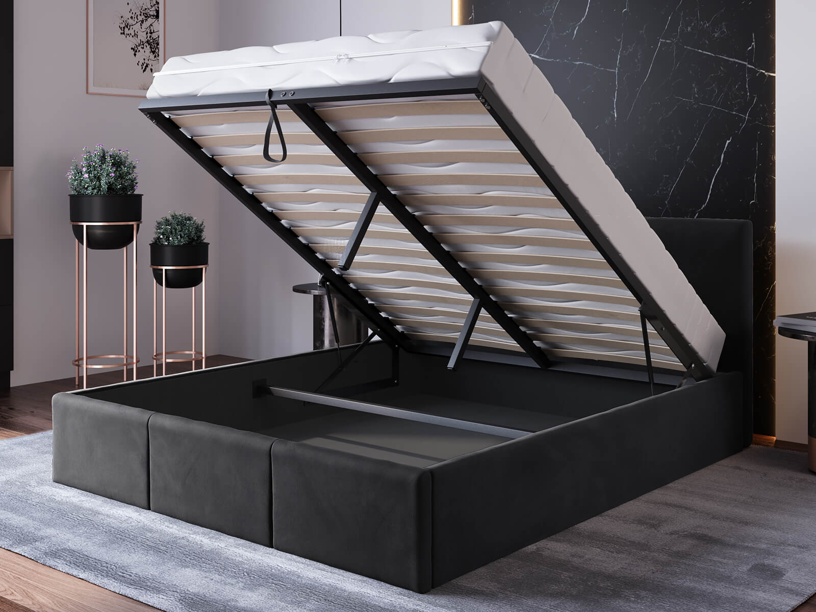 Ágyunk egyik legfontosabb tulajdonsága a kiváló minőségű fekete velúr kárpit szövet. Ez a szövet nemcsak kellemes tapintású, hanem rendkívül tartós és könnyen tisztítható is. Eleganciát és luxust kölcsönöz az ágynak.