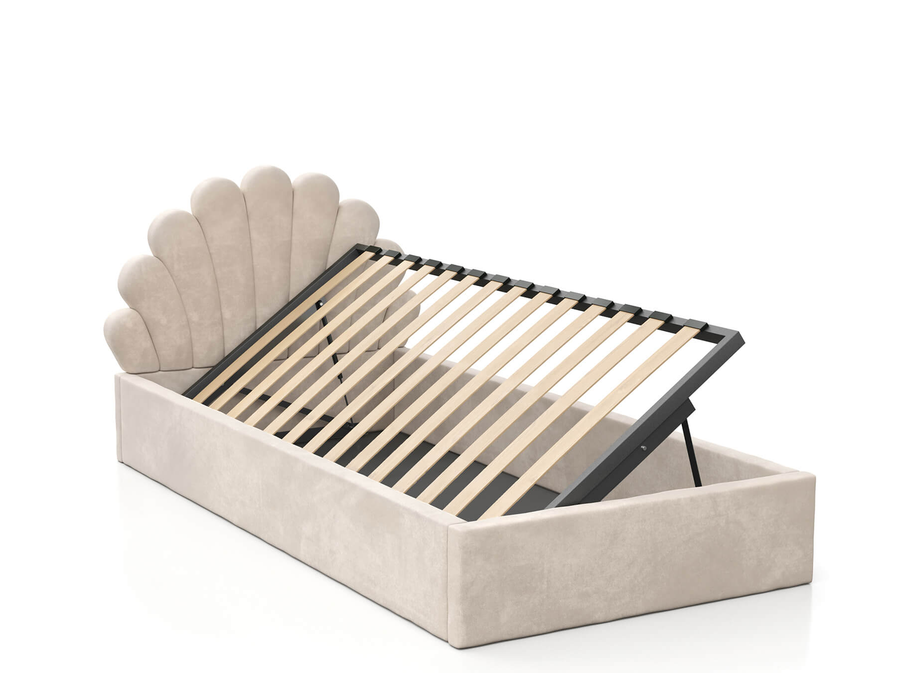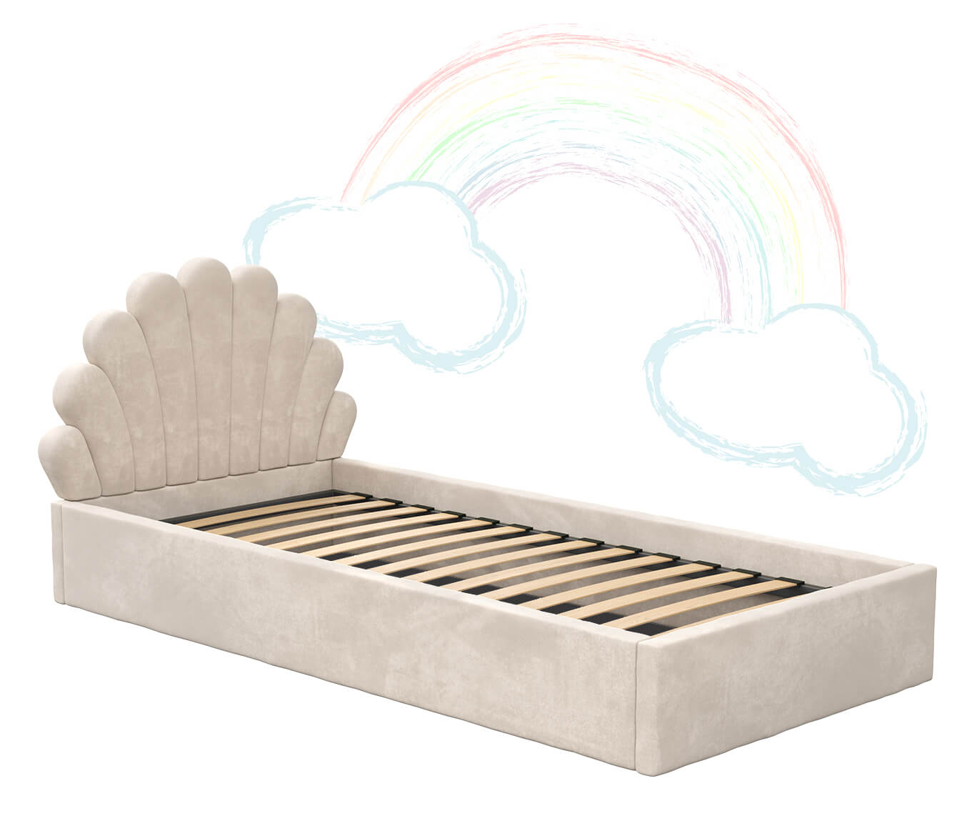 Kárpitozott gyerekágy 90x200 as konténerrel és kerettel, bézs színű Velvet Kids Line 3 Kagyló