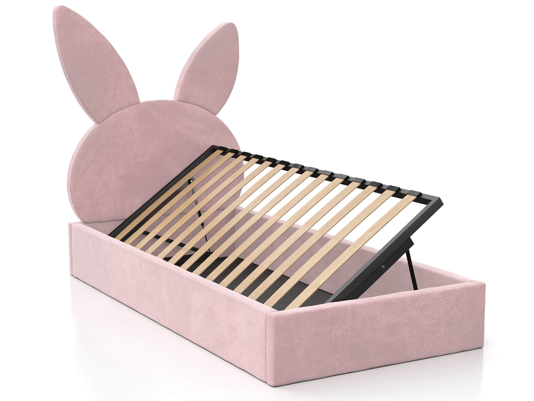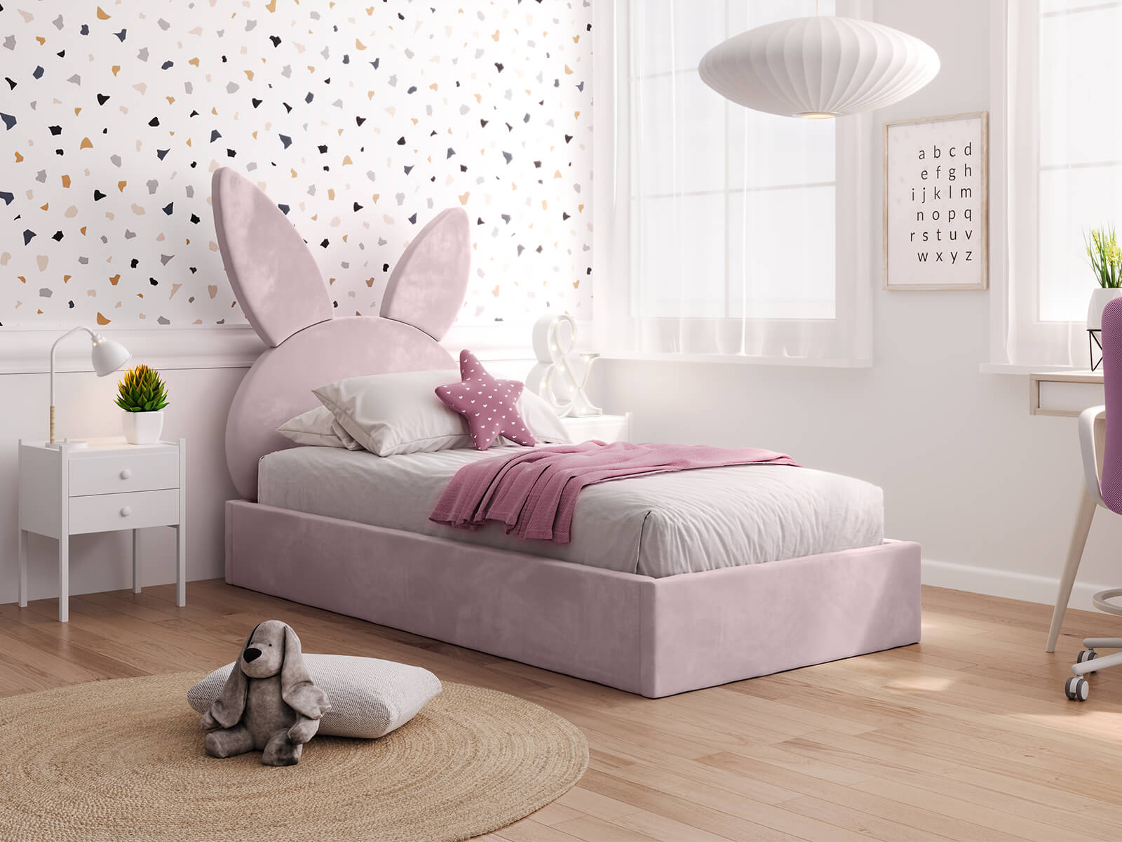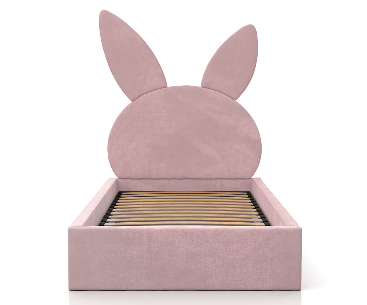 Kárpitozott gyerekágy 90x200 as konténerrel és kerettel, rózsaszín színű Velvet Kids Line 2 Nyúl
