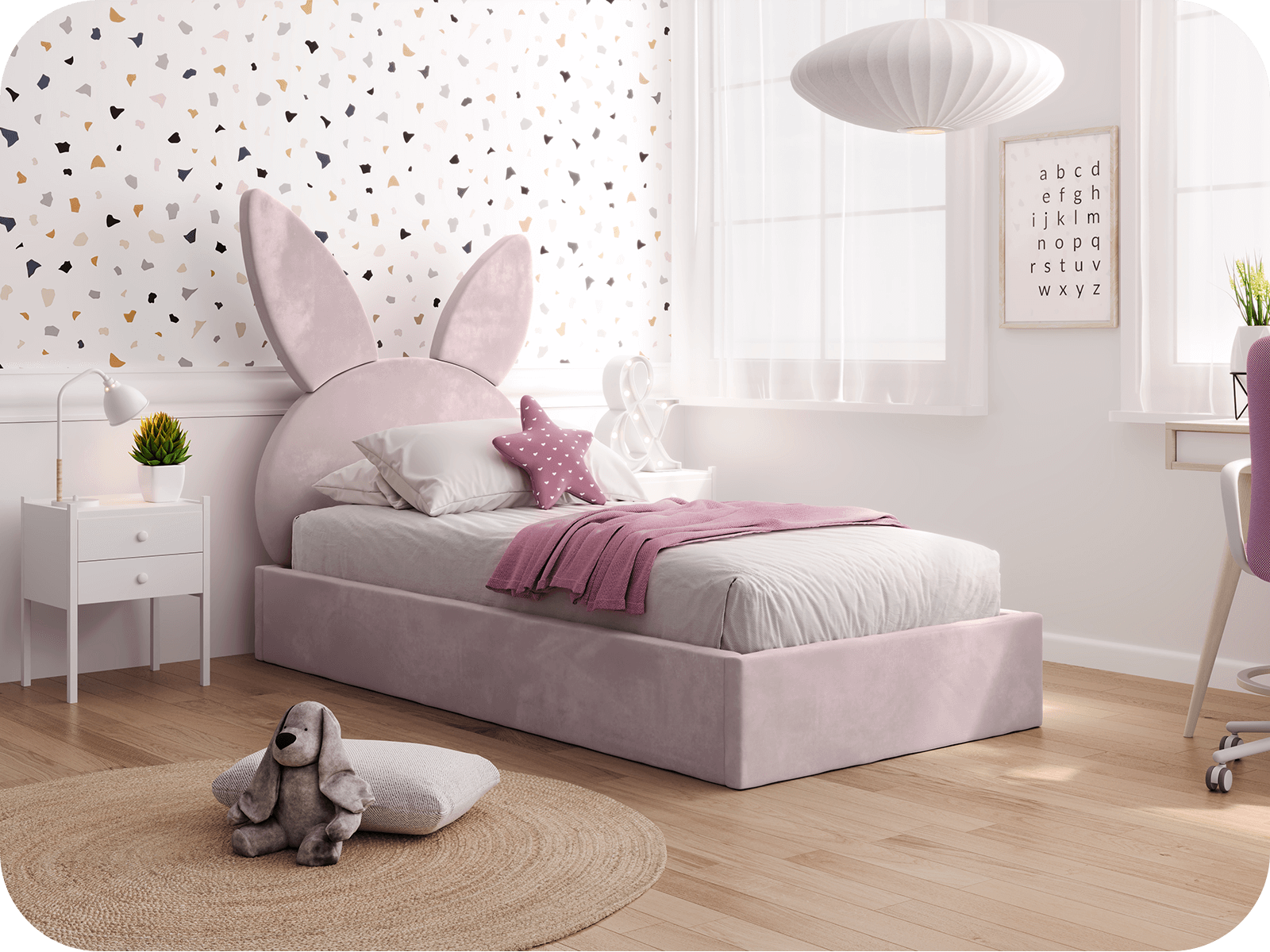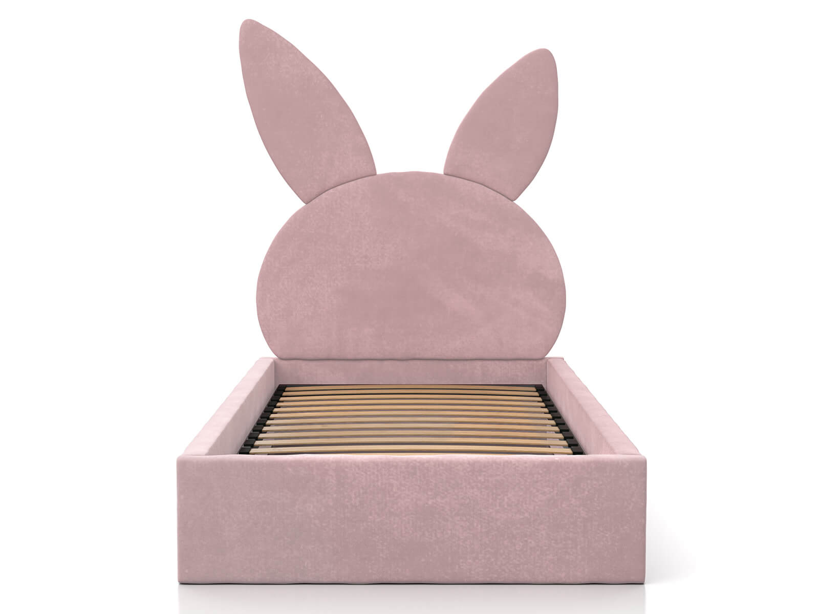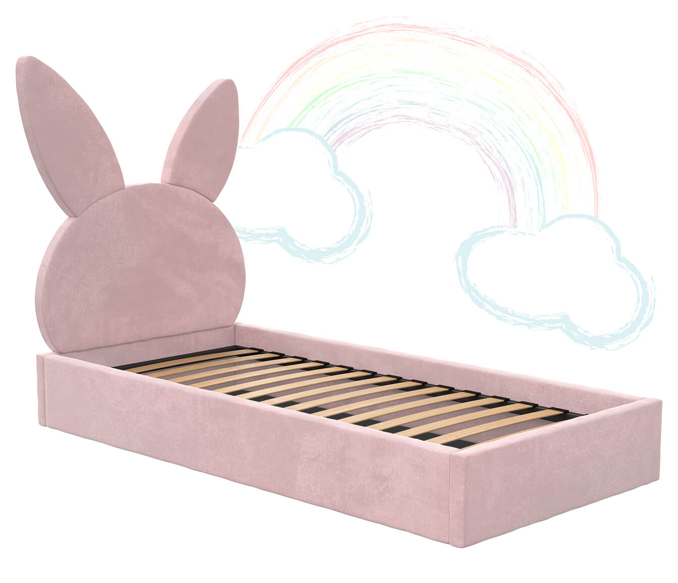 Kárpitozott gyerekágy 90x200 as konténerrel és kerettel, rózsaszín színű Velvet Kids Line 2 Nyúl