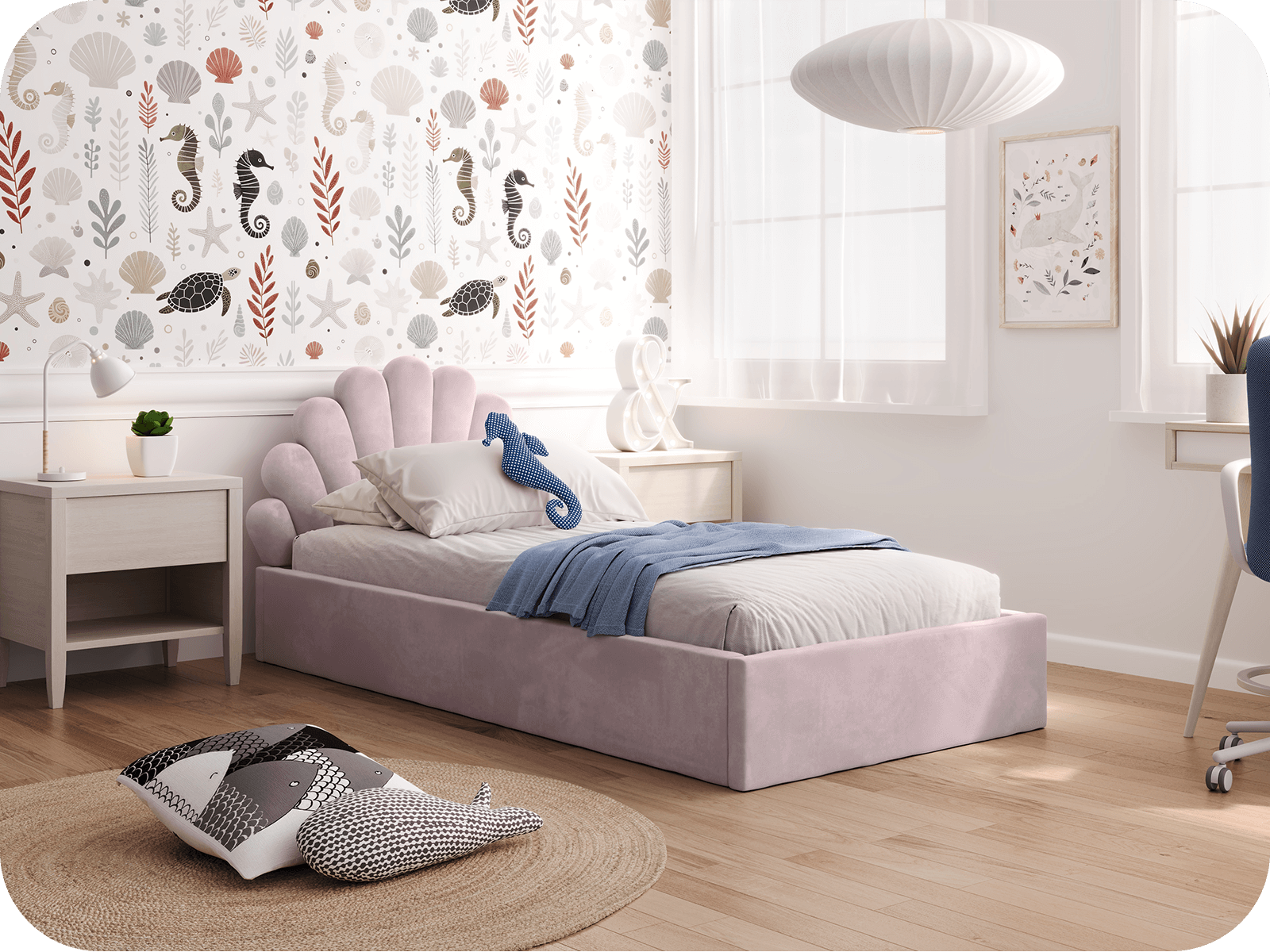 Design és funkcionalitás - A kagyló formájú fejvég, amely az alatti világ ihlette, minden álmot varázslatos alatti kalanddá változtat. Az ágy egyedi designja nem csak kényelmes alvást garantál, hanem izgalmas álmokat is az óceán titokzatos mélységeiről.