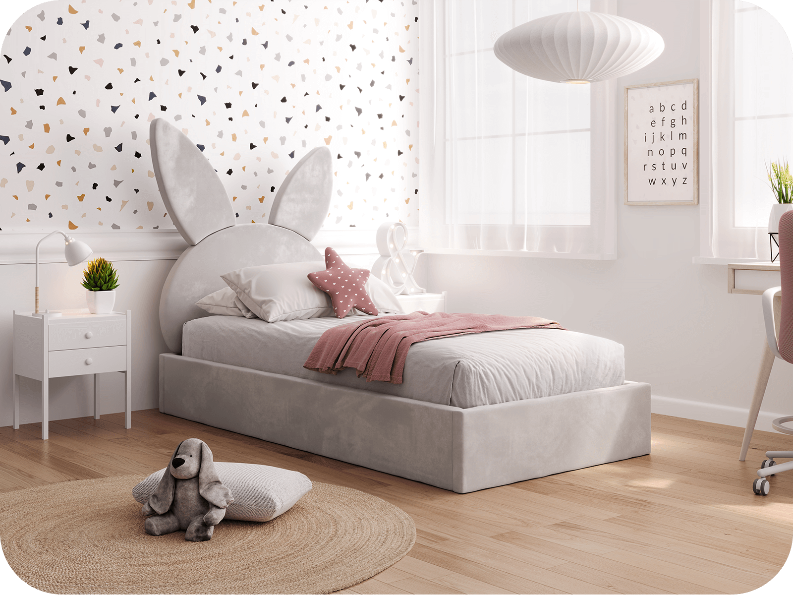 Kényeztesse csemetéjét egy hosszú és pihentető éjszakával a nyúl alakú fejtámlával ellátott kárpitozott ágynak köszönhetően! Termékünk nem csak stílusos eleme a gyerekszobának, hanem a kényelmes alvás és a biztonság garanciája is.