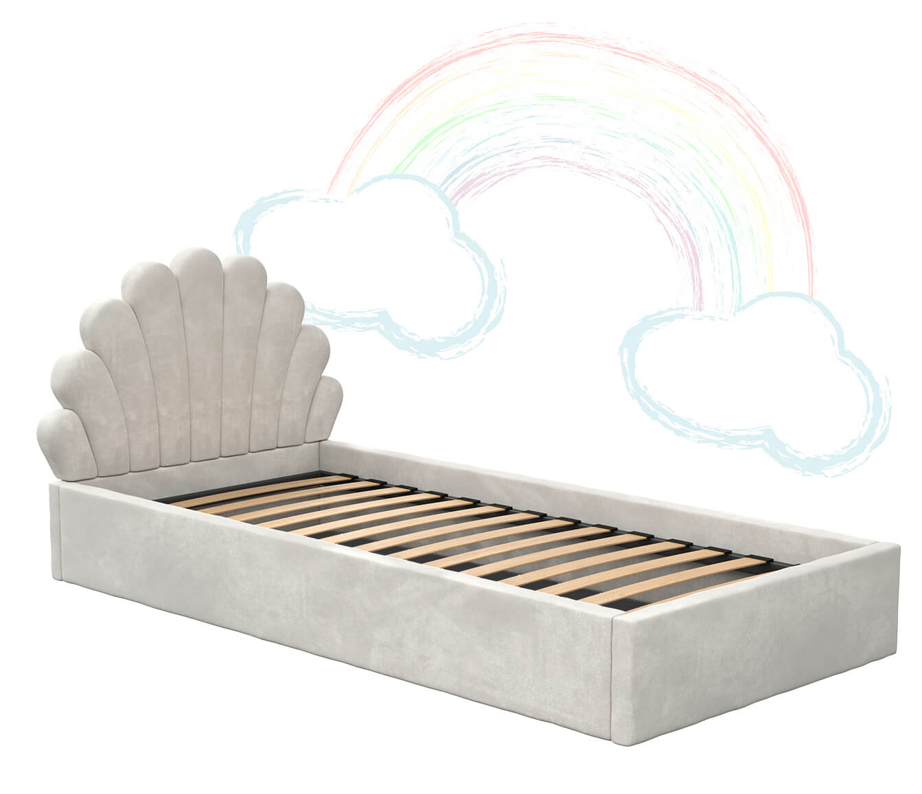 Kárpitozott gyerekágy 90x200 as konténerrel és kerettel, szürke színű Velvet Kids Line 3 Kagyló