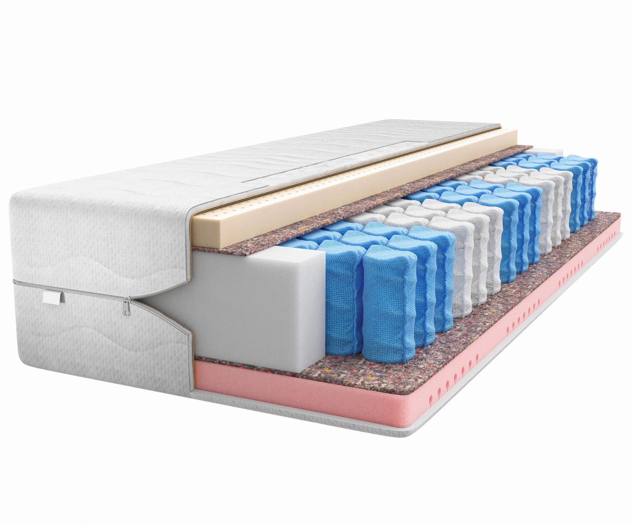 | 1. Cipzáras huzat - könnyen levehető és mosható huzat. Háromféle huzat közül választhat. 2. Latexhab - ortopédiai tulajdonságokkal rendelkezik. Kifejezetten ajánlott a hátproblémákkal küzdő emberek számára. Nagyon rugalmas és tartós. A porózus szerkezet megfelelő légáramlást biztosít. 3. Zsebrugók - külön zsebekbe vannak elhelyezve, ennek köszönhetően minden rugó önállóan működik, és működésük teljesen csillapított. A kínált betét 9 keménységi zónával rendelkezik a felhasználóhoz igazodva. 4. Filc - kiváló szigetelés a habréteggel ellátott rugók számára. Megerősíti a teljes matracszerkezetet. 5. HR hab - nagy rugalmasságú hab, amelyet a terhelés megszüntetése után dinamikus viselkedés jellemez. Nagy sűrűségének köszönhetően nagy ellenállás jellemzi a deformációval szemben. | ![]() |