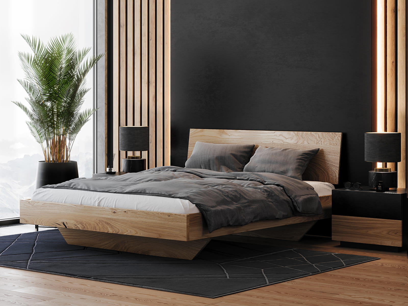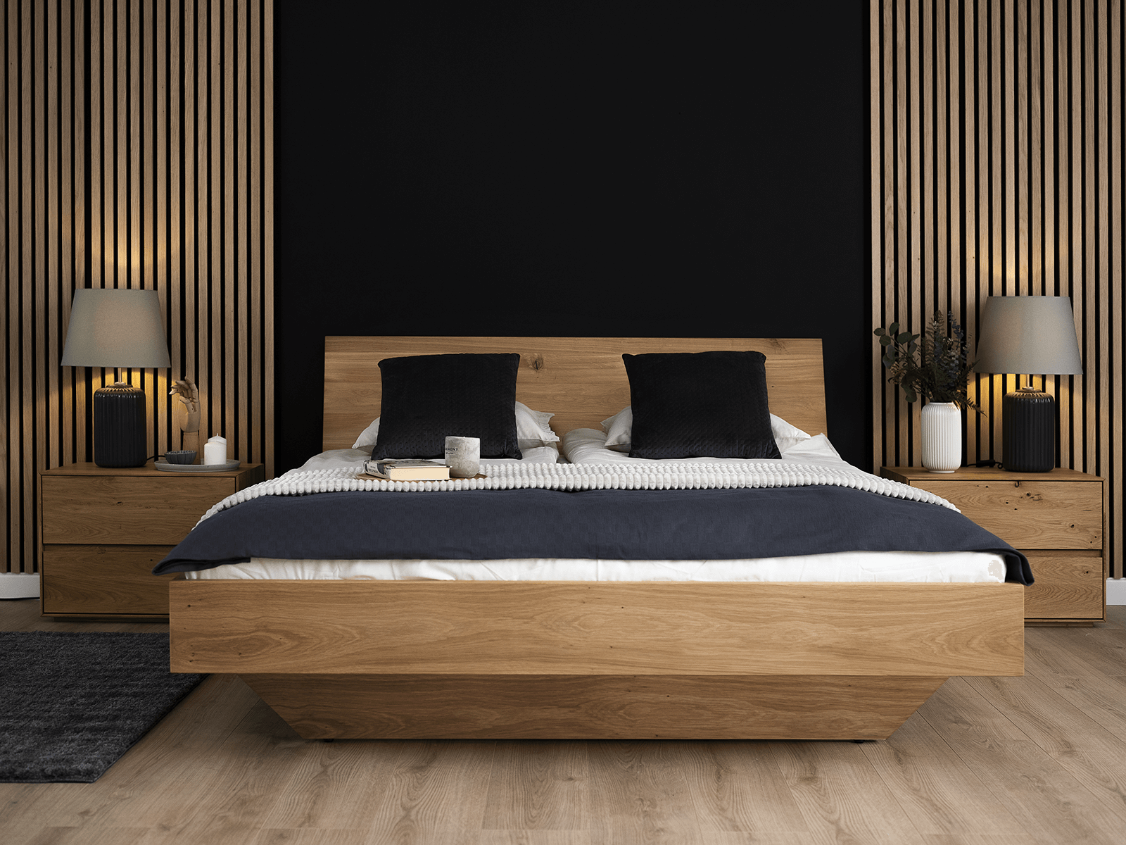 Az ágy a képeken látható váz és kiegészítők nélkül kerül forgalomba. Javasoljuk, hogy válasszon keretet tartalmazó állványt, amely a konfigurátorban elérhető. A bútorokat önösszeszerelő csomagokban szállítjuk.